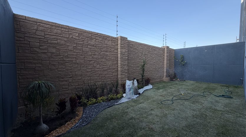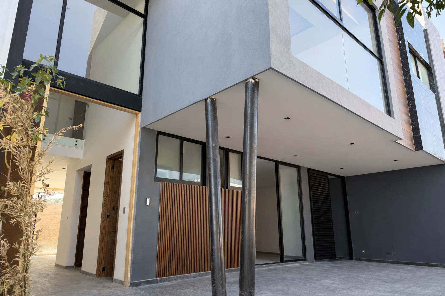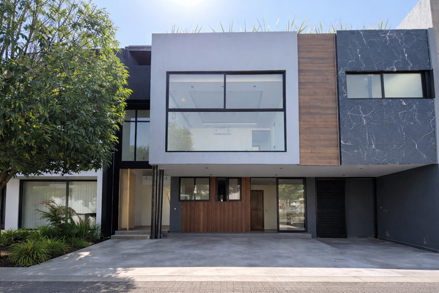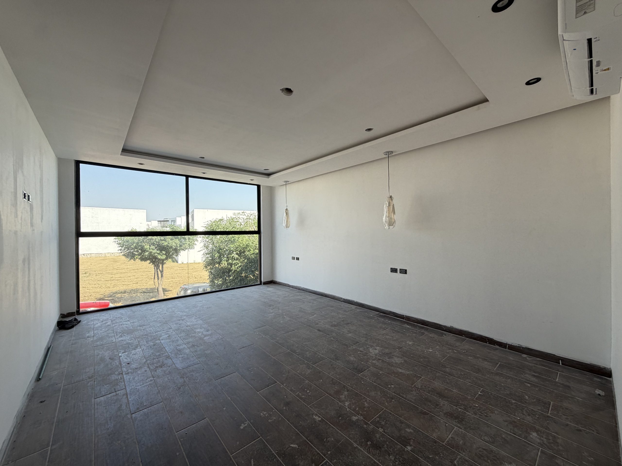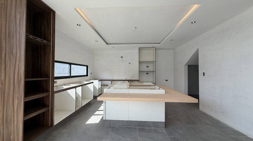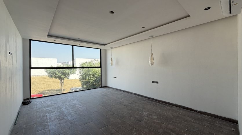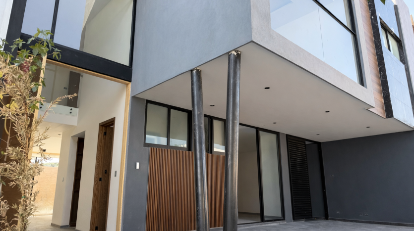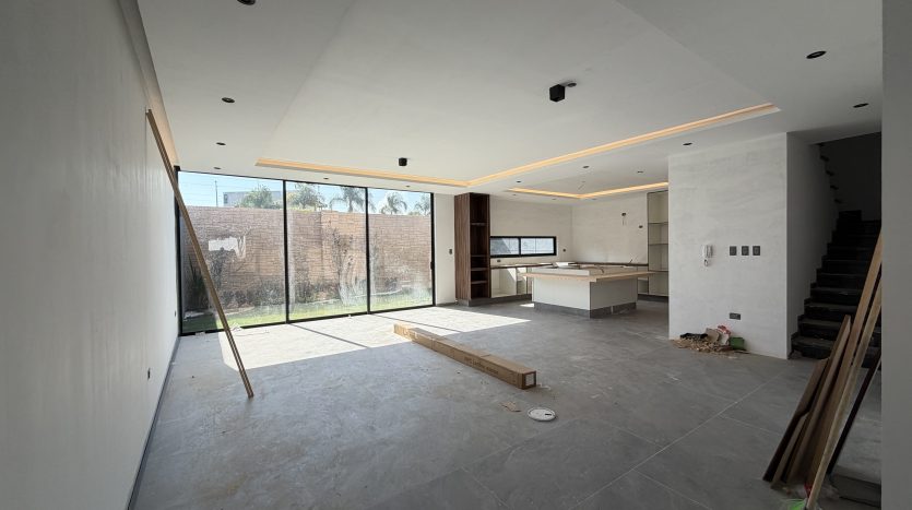 Vestíbulo, sala, comedor, cocina integral con isla y placa de granito, alacena, medio baño, recámara secundaria 1 con closet y baño completo, estacionamiento semi-techado para 2 autos y amplio jardín.