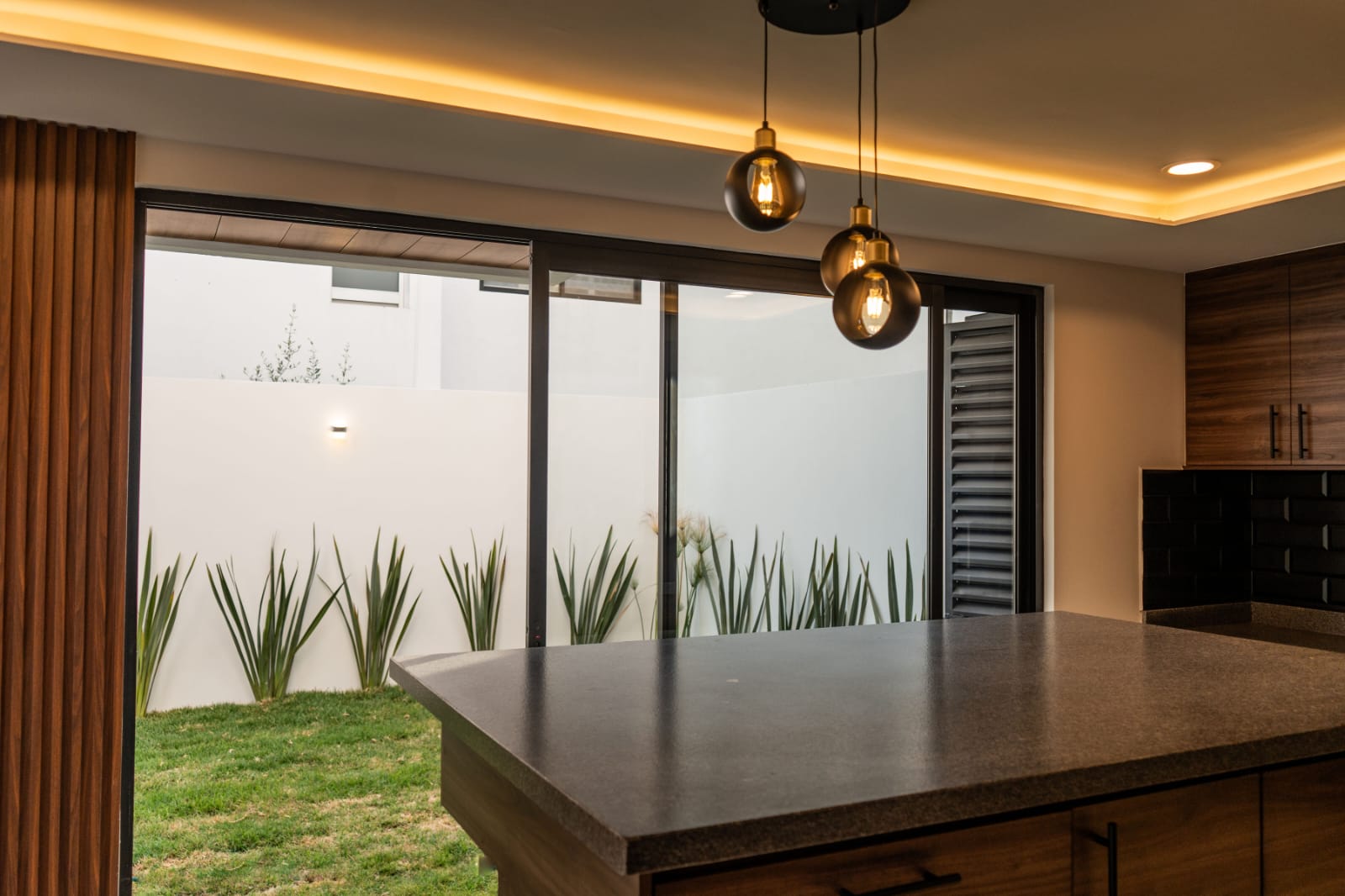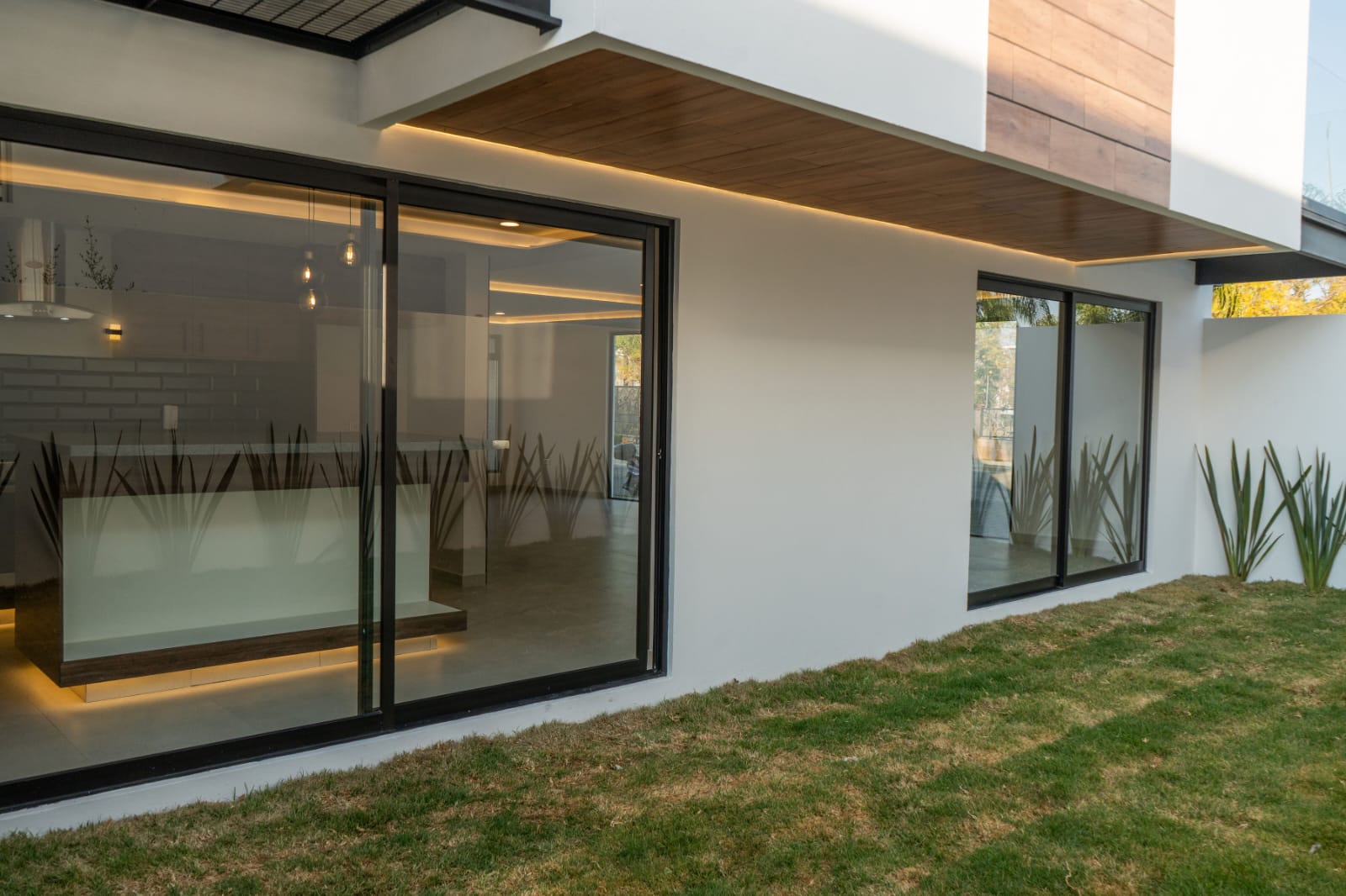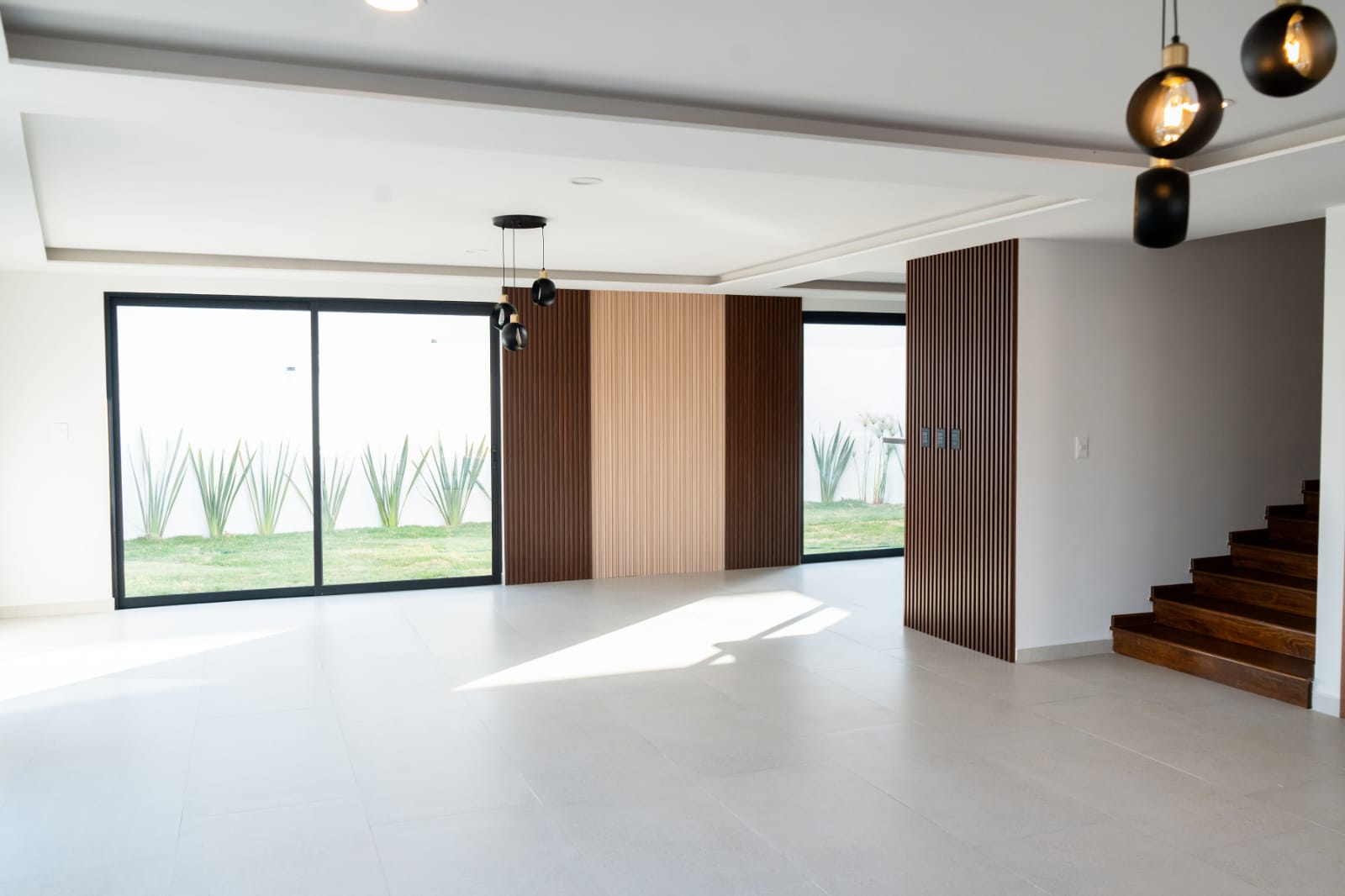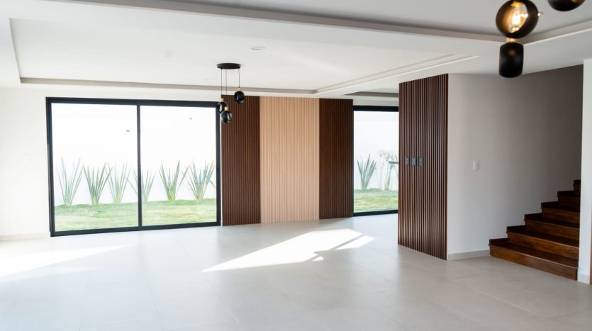 - Sala y comedor con ventanales de piso a techo hacia el jardín