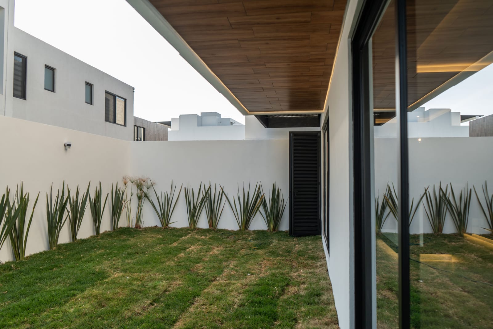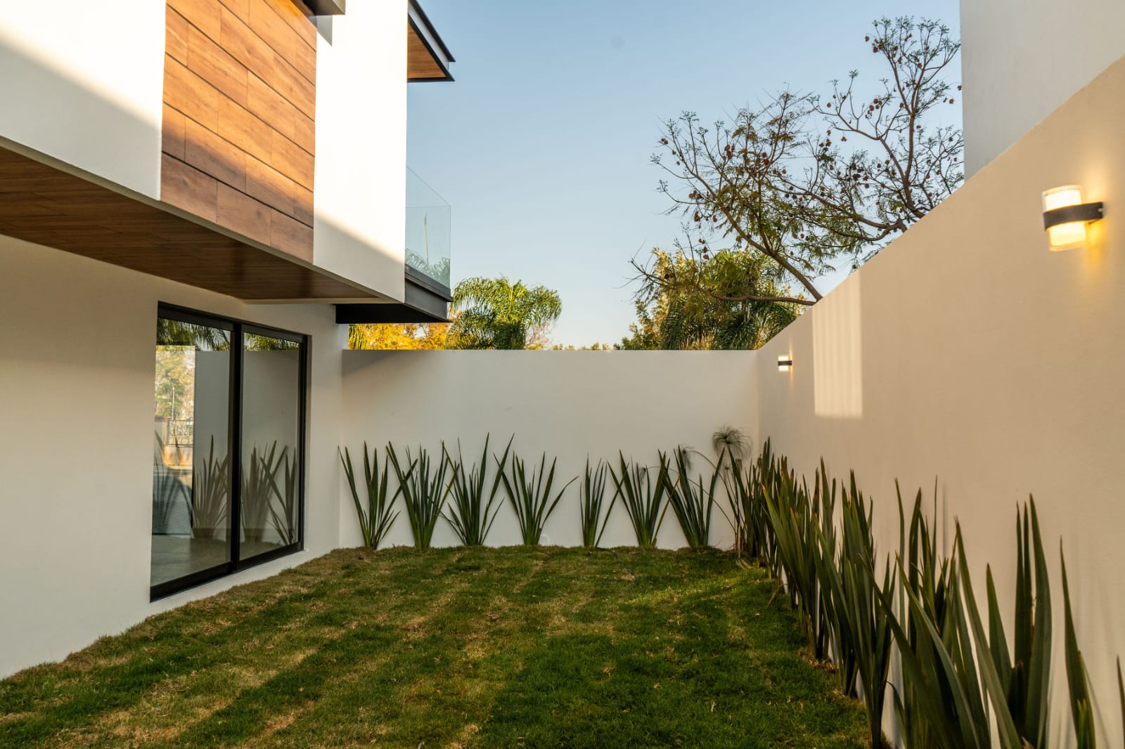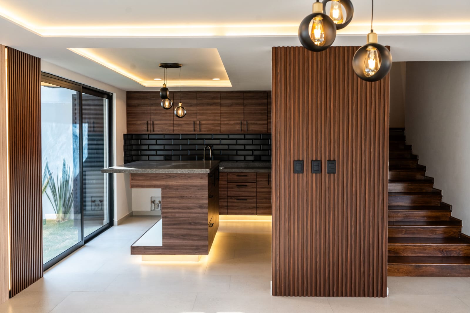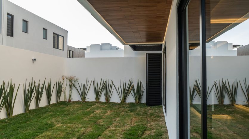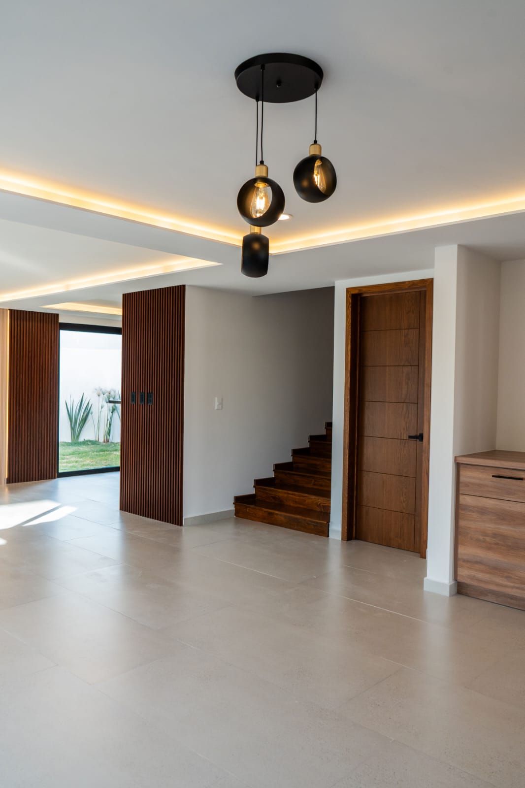 - Sala y comedor con ventanales de piso a techo hacia el jardín